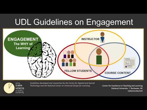 Universal Design for Learning, or UDL, is a set of learning design principles that increase access and reduce barriers for all types of learners. This video offers strategies for engagement, one of the three UDL principles promoted by CAST. Engagement considers how students are motivated to learn the content by connecting course concepts to their academic, professional and personal lives.